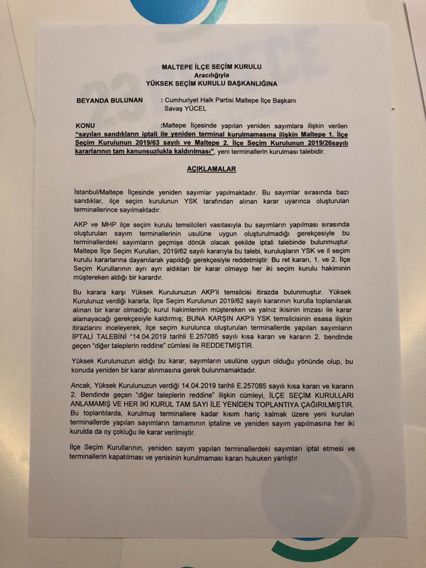 Cumhuriyet Halk Partisi Maltepe 1. ve 2. İlçe Seçim Kurulları tarafından, sayılan sandıkların iptal edilmesi kararının iptali için İl Seçim Kurulu’na itiraz etti.