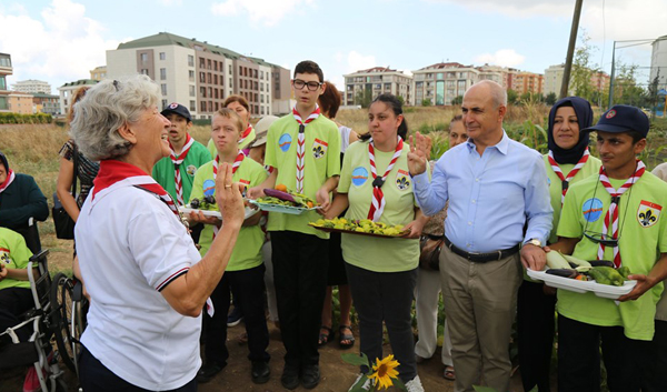 Hobi bahçelerinde olgunlaşan patlıcan, biber ve domatesleri Başkan Akgün’le birlikte toplamanın keyfini süren engel tanımayan izciler toprakla uğraşarak hem doğal ortamda rehabilite oluyor hem de sosyalleşiyor.