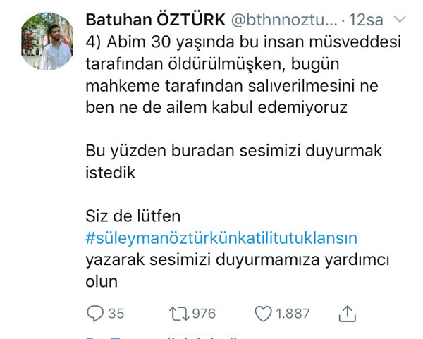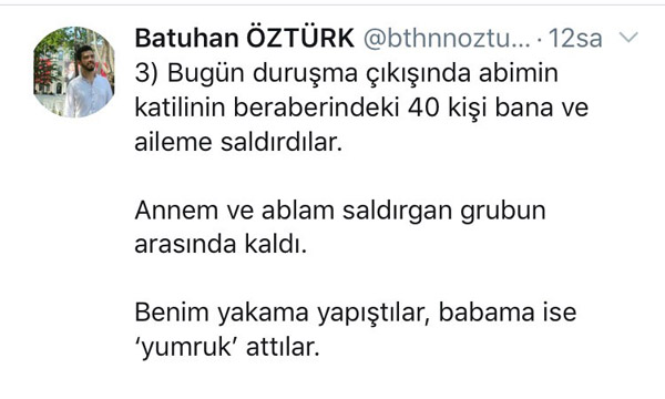 Paylaşımının devamında Öztürk "Bugün duruşma çıkışında ağabeyimin katilinin beraberindeki 40 kişi bana ve aileme saldırdılar. Annem ve ablam saldırgan grubun arasında kaldı. Benim yakama yapıştılar, babama ise ‘yumruk’ attılar. Ağabeyim, 30 yaşında bu insan müsveddesi tarafından öldürülmüşken, bugün mahkeme tarafından salıverilmesini ne ben ne de ailem kabul edemiyoruz. Bu yüzden buradan sesimizi duyurmak istedik. Lütfen sesimizi duyurmamıza yardımcı olun" ifadeleriyle sosyal medya kullanıcılarından destek istedi.