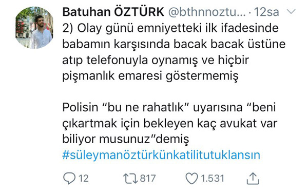 Sürücünün serbest bırakılmasına tepki gösteren ve tutuklanmasını isteyen Batuhan Öztürk, sosyal medya hesabından yaptığı paylaşımlarda "27 Aralık 2018 tarihinde Iraklı İrfan Jasim Wali Wali aşırı hızlı kullandığı Range Rover araç ile kırmızı ışıkta geçerek ağabeyime çarptı. Ağabeyim 40 metre savrularak hayatını kaybetti. Ağabeyimin katilini bugün ilk duruşmada serbest bıraktılar. Olay günü Emniyetteki ilk ifadesinde babamın karşısında bacak bacak üstüne atıp telefonuyla oynamış ve hiçbir pişmanlık emaresi göstermemiş. Polisin “Bu ne rahatlık” uyarısına “Beni çıkartmak için bekleyen kaç avukat var biliyor musunuz?” demiş.” ifadelerini kullandı.