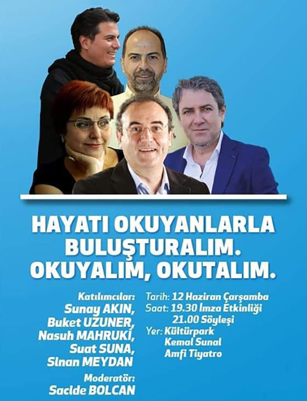 Buket Uzuner, Sunay Akın, Sinan Meydan, Nasuh Mahruki ve Suat Suna gibi yazarlar Kültürpark Amfi Tiyatro’da okurlarıyla buluşacak. Kitapsever Büyükçekmeceliler, okuma köşeleri ve dünya kütüphaneleri resim sergisi açılışının ardından yazarlar kitaplarını imzalatacak. Belediye Başkan Danışmanı Tarihçi – Yazar Sacide Bolcan moderatörlüğünde düzenlenecek söyleşi programında ise AZARLAR KİTAP OKUMA ALIŞKANLIĞI VE KİTAP SEVGİSİNİ KONUŞACAKLAR.