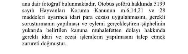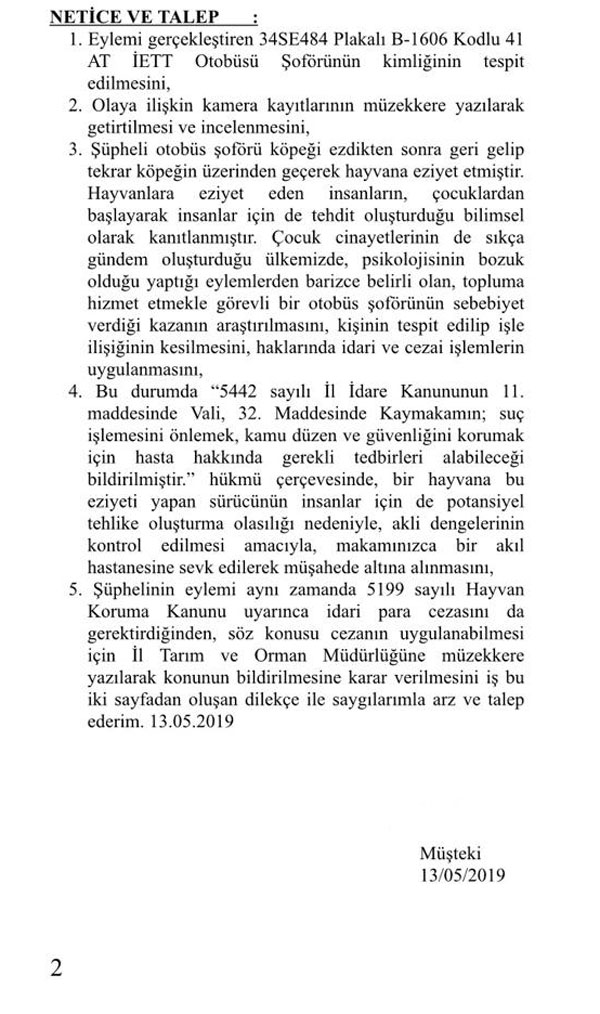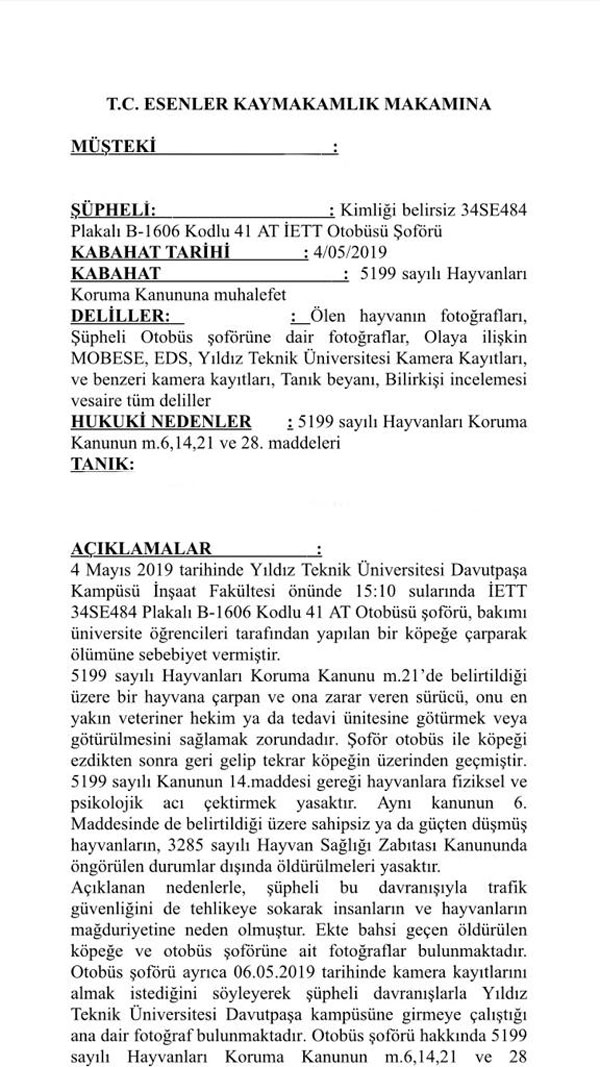 Olayı Yıldız Teknik Üniversitesi Hayvan Hakları Kulübü duyurdu. 6 Mayıs Pazartesi günü YTÜ HayHak’tan bir grup öğrenci ve İstanbul Barosu Hayvan Hakları Merkezi üyesi Av. Nur Dilara Yılmaz olayı fotoğraflarla belgeleyerek Çağlayan Adliyesi’ne kimliği belirsiz B-1606 kodlu 41 AT İETT otobüs şoförü hakkında, Trafik Güvenliğini Kasten Tehlikeye sokmak, Kamu Görevini Kötüye Kullanmak, 5199 sayılı “Hayvanları Koruma Kanununa muhalefet”ten suç duyurusunda bulundu. Şikayet incelenmeye devam ediliyor. Şikayet incelenmeye devam ediliyor.